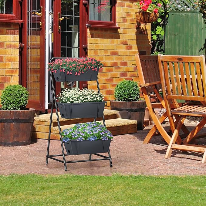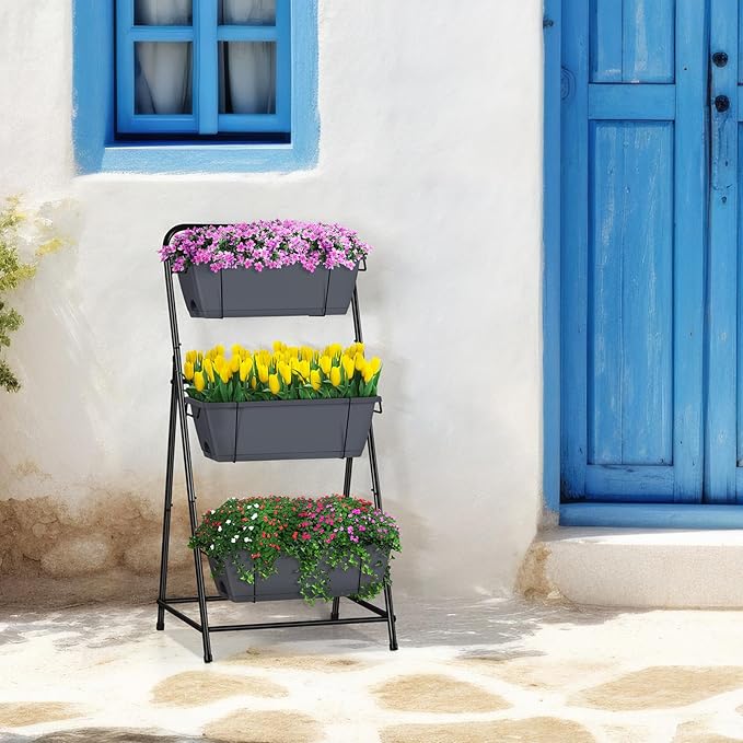 Vertical Garden Planter 3 Tier Raised Garden Bed Herb Planter Outdoor Standing Garden Planter Box with Drainage Holes Removable Tray for Patio Balcony Porch Grey