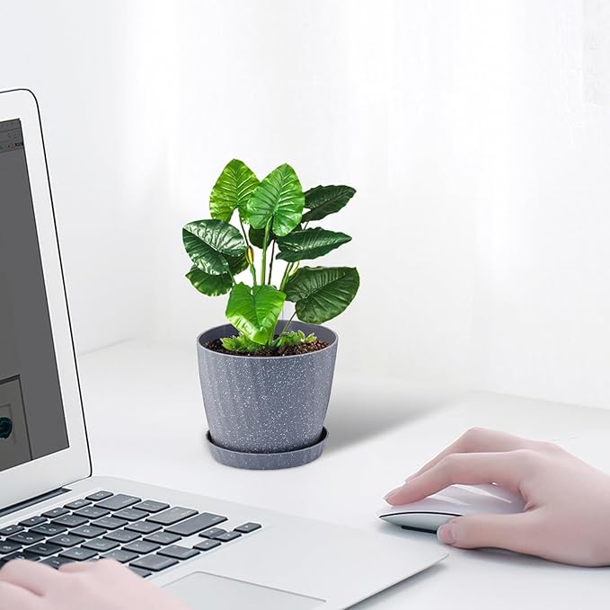 6 Inch Plant Pots Bulk, 6 Pack Plastic Planters with Drainage Holes and Saucers for Indoor Outdoor House Plants and Flowers, Grey Spots