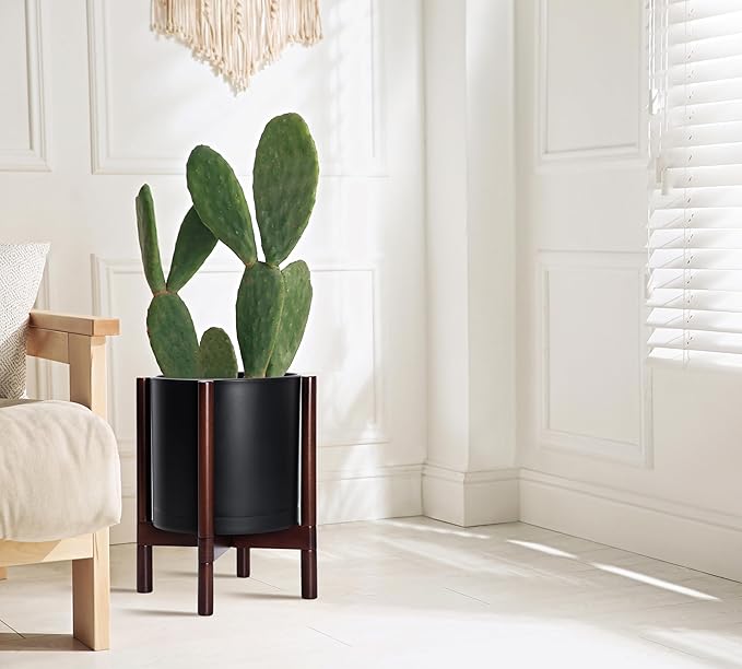 - A Complete Set: Minimalist plastic planter, combined with a sculptural, solid wood stand that match perfectly together and looks great in any home.