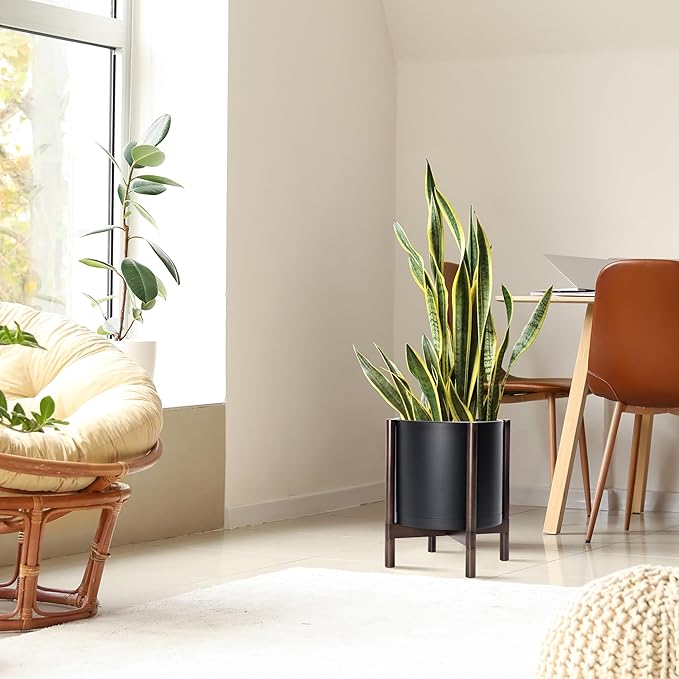 - A Complete Set: Minimalist plastic planter, combined with a sculptural, solid wood stand that match perfectly together and looks great in any home.