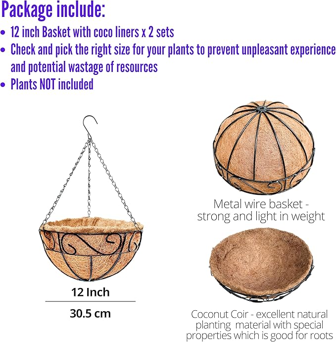 - 2-PACK SET: 12 Inch, large size. Pick the right size for your plants to prevent unpleasant experience and potential wastage on resources. Flowers and Plants are NOT included. These metal hanging planters are ready to hang with hanging chain and hook. Assembly not required