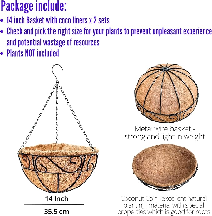- 2-PACK SET: 14 Inch, extra large size. Pick the right size for your plants to prevent unpleasant experience and potential wastage on resources. Flowers and Plants are NOT included. These metal hanging planters are ready to hang with hanging chain and hook. Assembly not required