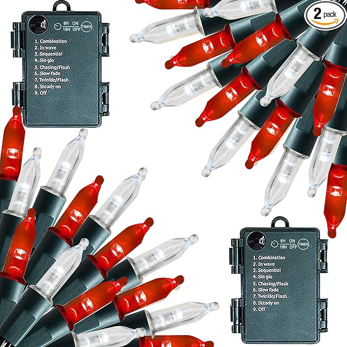 Dazzle Bright Battery Operated Christmas Lights, 2 Pack Total 32FT 100LED Clear Mini String Lights Waterproof with 8 Modes for Xmas Indoor Outdoor Yard Holiday Wedding Decorations (Red and White)