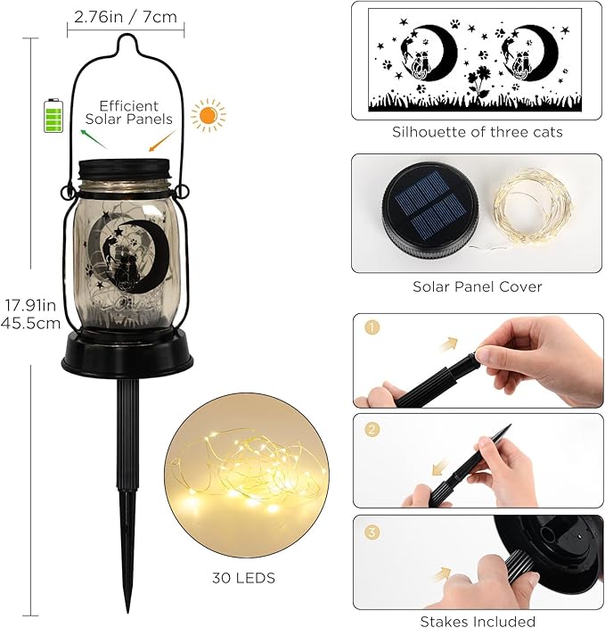 - WEATHERPROOF & EFFICIEN SOLAR POWERED LANTERN: The solar cat lantern charges 6 hours in daylight for 8+ hours of night glow (switch on). IP65 waterproof, it shines through rain, ensuring continuous light. Crafted for durability, its upgraded solar panel stabilizes string lights. Effortless operation: press to activate, auto on/off at dusk/dawn. No electricity, cords, or maintenance needed. Please ensure that the power switch is in the "ON" position when using