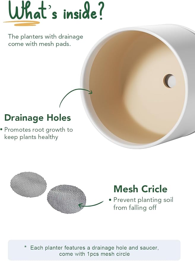 - Thoughtful Accessories: Our planters for indoor plants include drainage hole net and saucers, giving you full control; Let roots enjoy moisture while avoiding excess water; Seal with a saucers to prevent leaks or use a mesh pad to retain soil and provide optimal ventilation (Tray and pot cannot be separated)