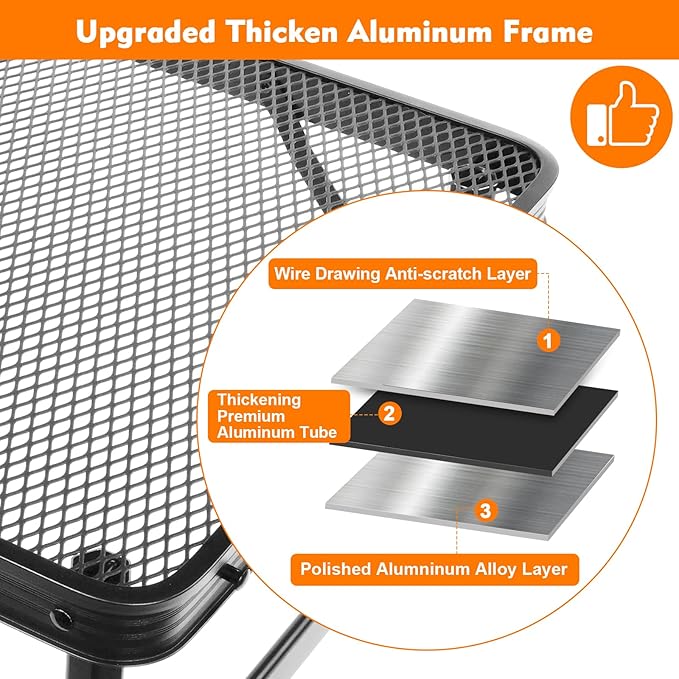 - [Robust and Sturdy] The folding table is made of high-quality aluminum alloy, ensuring its sturdiness and durability. The table top is designed with a metal mesh surface and has been treated with a thickened paint coating, allowing it to withstand prolonged exposure to high temperatures.When stored in the garden, it is resistant to rain and snow, as the limited contact area with the table surface minimizes the risk of staining and rusting