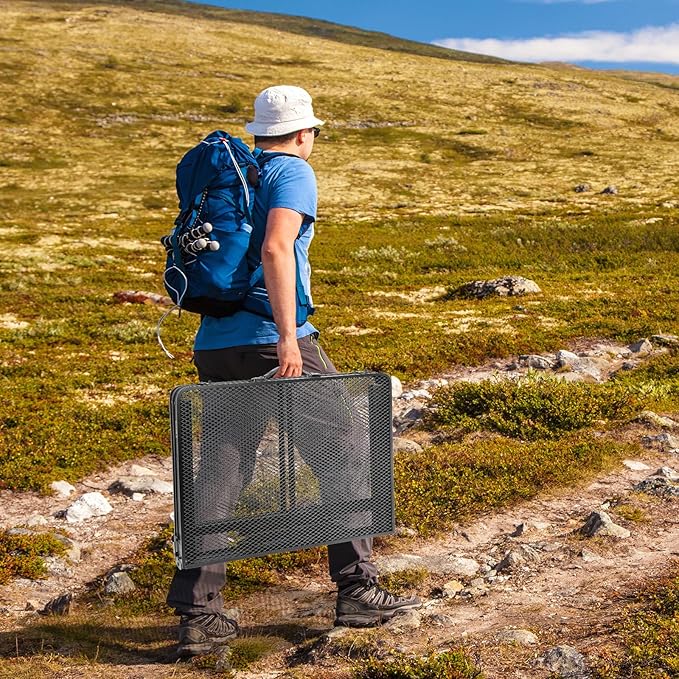 - [Lightweight and Portable] Folded, the package measures 23.6×17.7×2.56 inches, and the weight only 3.4 kg/7.5 lbs,easily fitting into your car or RV. It can be used as a camping table, bbq table, patio table, picnic table, side table, outdoor activities, campfire, card table, etc