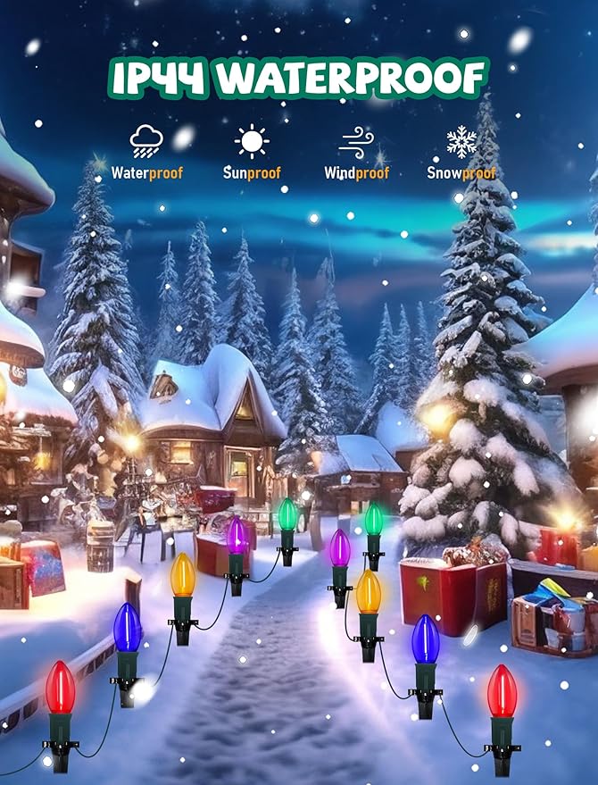 - ✨Practical and waterproof: C9 led multicolor christmas string lights outdoor is hanging and plugging, Hang up C9 colorful string lights around your roofline decor or plug the C9 christmas driveway lights in lawn garden. led christmas pathway string lights is crafted for outdoor use, these lights are built to withstand the elements. They're weatherproof and designed to endure rain, snow, and wind, ensuring they keep shining through the holiday season.
