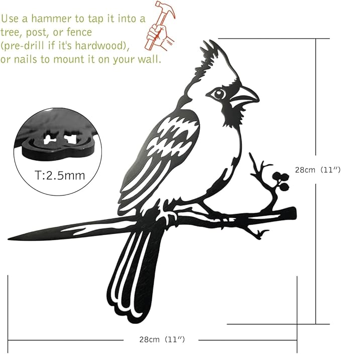 - [EASY INSTALLATION]: This metal bird tree stake is a breeze to set up. Use a hammer to tap it into a tree, post, or fence (pre-drill if it's hardwood), or nails to mount it on your wall. Whether you're decorating your garden, patio, or home, our metal bird decor makes it easy.In any case, you have a problem with products, just contact us, we will help you solve the problem as soon as possible.
