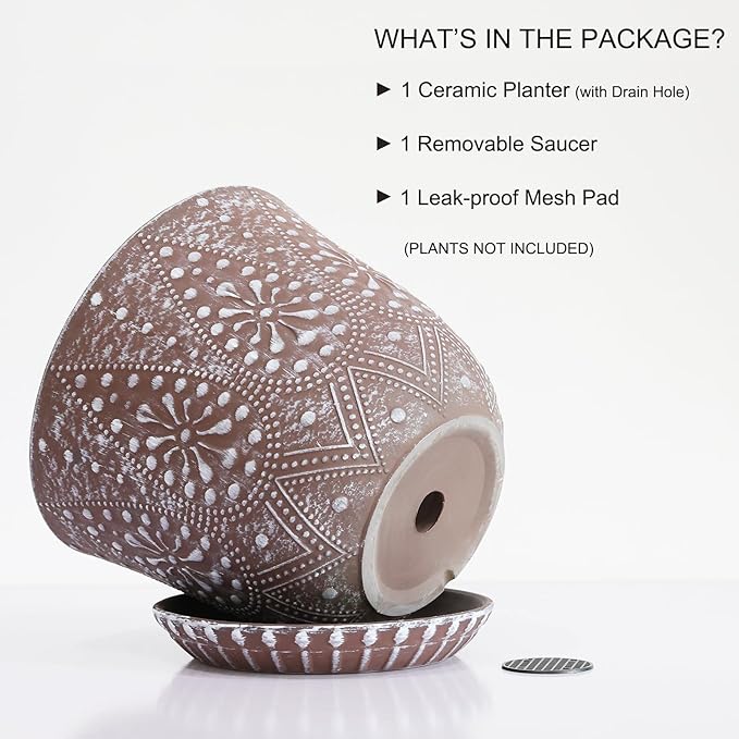 - Size & Package: 8.0 Inch Pot . Package: contains 1 ceramic flower pots, 1pcs mesh pads and 1pcs saucers(NOT INCLUDE PLANTS)