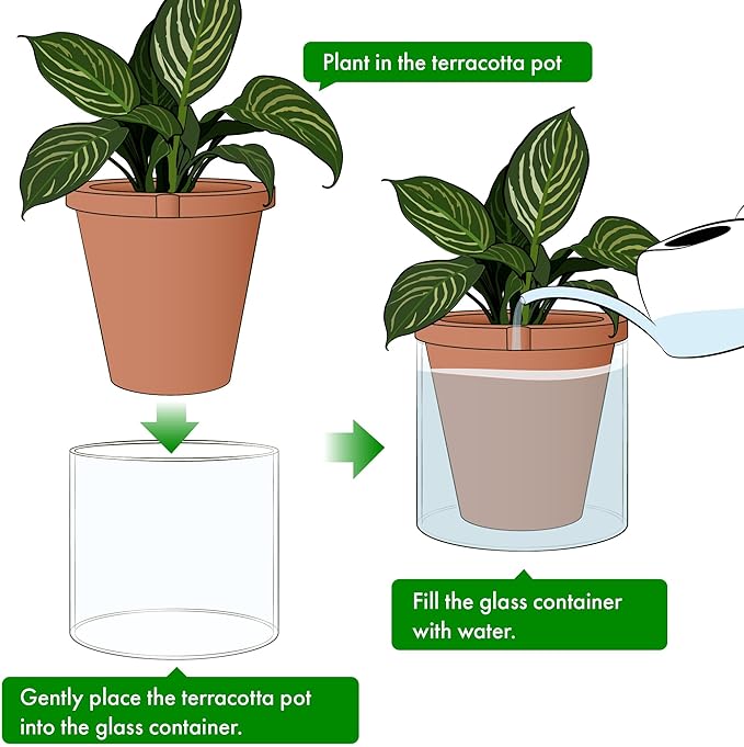 - Stylish Design with Perfect Combination – Newly designed self-watering pot with magical combination of terracotta succulent pot with a glass reservoir. Functional, attractive and stylish plant pot set.