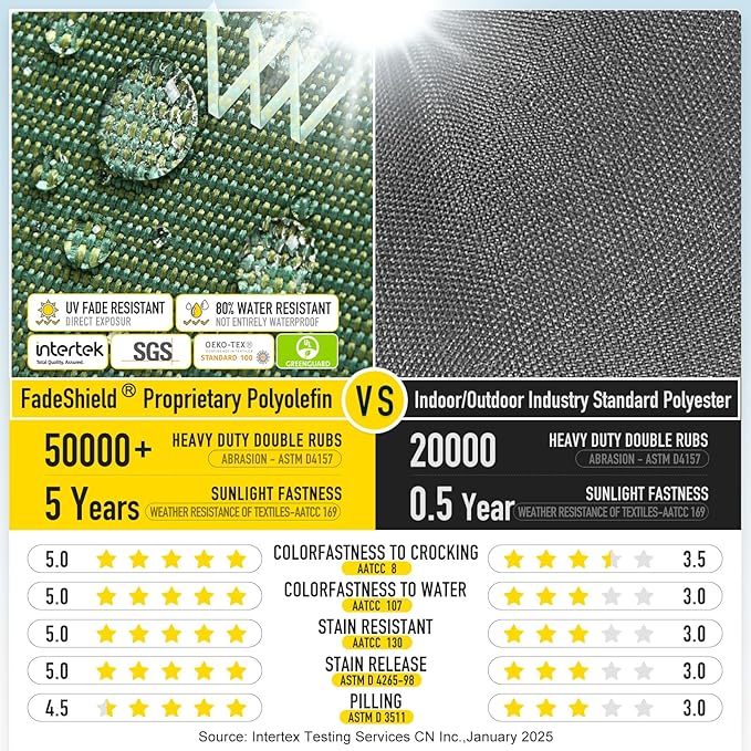 - 【FadeShield - UV Fade Resistant】FadeShield Proprietary Polyolefin are dependable indoor/outdoor performance fabrics, they are infused with antimiсrоbial silver Ion technology and can withstand 5 years of UV fade resistance, solution-dyed to make sure that each color is deeply ingrained in every fiber for continued vibrancy, even after heavy use. We recommend bringing it indoors when it rains or when not in use to preserve its lifespan and keep it looking beautiful.