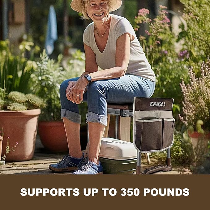 - Unbreakable, Foldable, and Ready-to-Go! Our garden kneeler is as sturdy as your grandma's oak tree swing, supporting up to 350 pounds with ease.. It's ready-to-use, no assembly required – just unfold, and voilà! And, guess what? It's not just a kneeler; it's a garden stool too! Snap-lock it, and you're all set for a throne-like experience. Aimerla Kneeler: making gardening chic and a breeze. Aimerla Kneeler: making gardening chic and a breeze