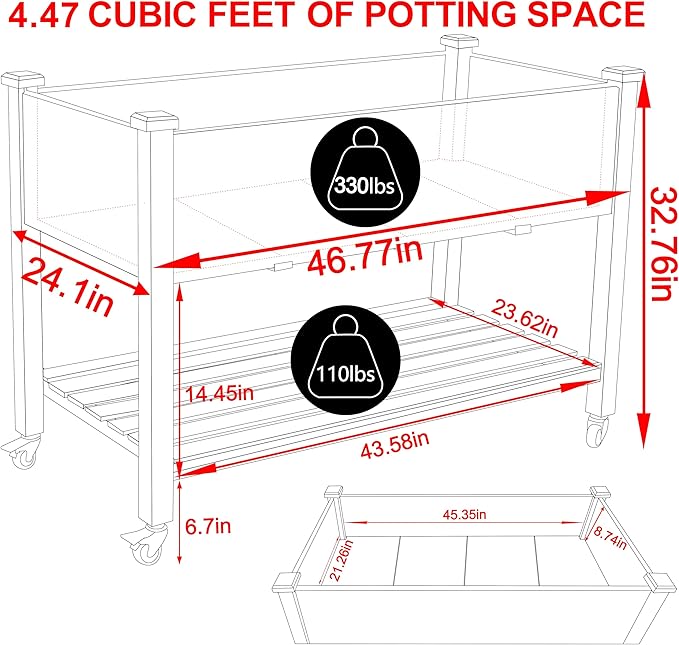 - DIMENSION-The overall size of raise garden bed: 47.1''W x 22.6''D x 32.7''H. The depth of raised garden bed: 8.6''. The height of legs:19.4''. The height from shelf to ground: 6.3''. The height from shelf to the raised garden bed: 13.1''. The weight capacity of raised garden bed: 220lbs. The weight capacity of shelf: 110lbs. The maximum potting space capacity: 4.47 cubic feet.