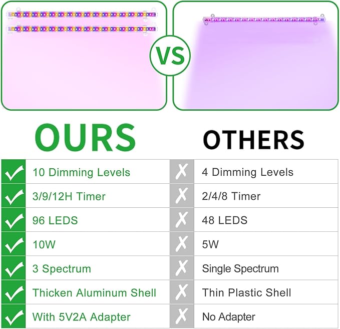 - 【Material Safety & Easy Installation】All aluminum material, strong corrosion resistance, hard to melt. The grow light pack comes with screws, ties, double-sided tapes and magnets to provide four mounting options. Compact design fits for various fixtures and surfaces. The power cord is 96 inches long for easy using in office,indoor,plant shelf,greenhouse etc.