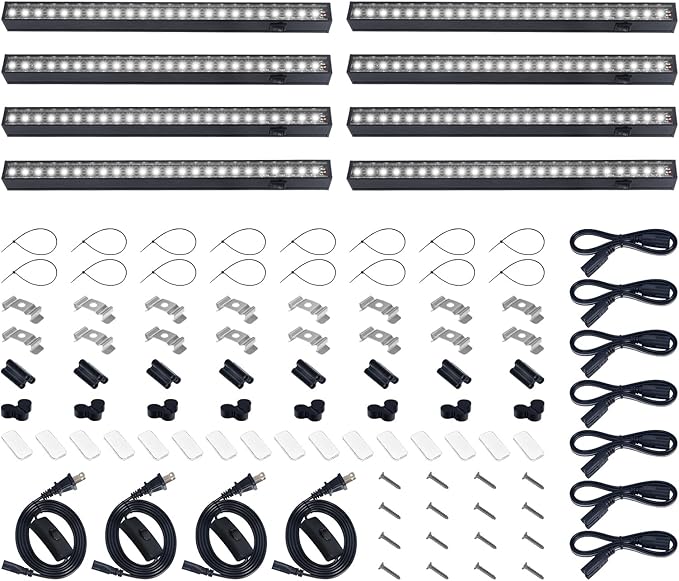 - What You Get: 8 x Barrina t5 Grow Light, 4 x Power Cord with ON/OFF Switch, 7 x Connecting Cord(20''), 16 x Installation clip, 16 x Cable tie, 16 x Magnetic bar with double-sided tape, 8 x Small connector, 8 x Dust cap