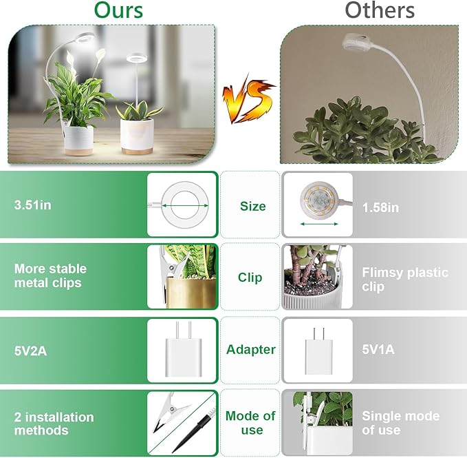- Pot Clip Plant Light: This led grow lights have two installation methods; They can not only be clamped on the edge of pots, desktops or plant stands, but can also be inserted into the soil, making them flexible to use and not limited by scenarios.