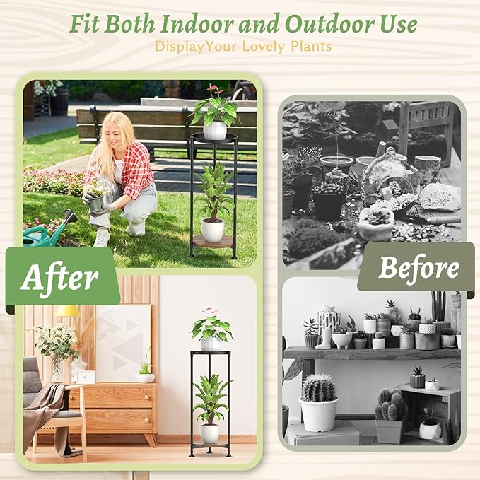 - 【Space Saving Black Plant Stand】: The upgraded two trays have an 11.1 inch diameter, making them suitable for displaying heavier and larger plant pots. The compact and vertical design fits into various corners without taking up too much space.