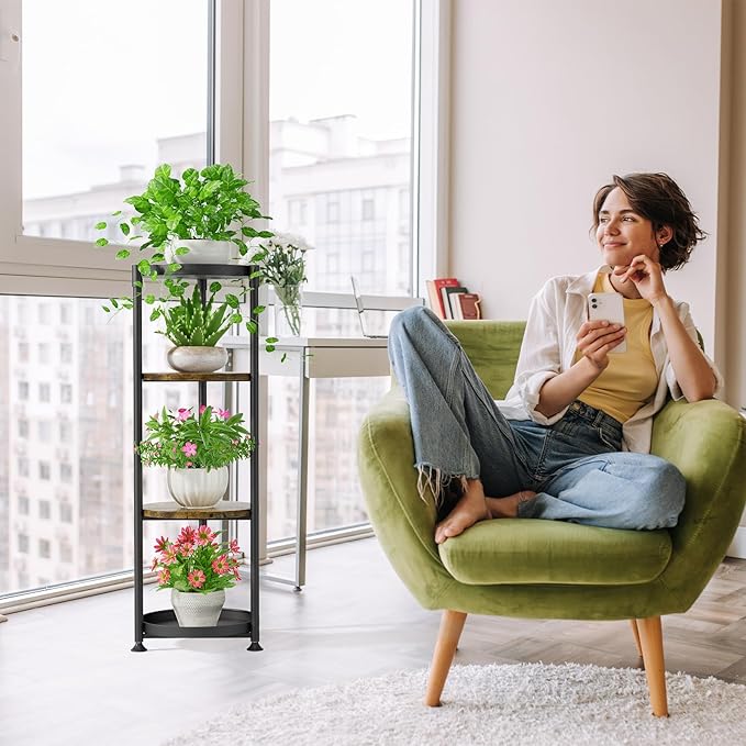 iDavosic.ly 4 Tier Corner Plant Stand Indoor, 45 Inch Tall Vertical Metal Flower Heavy Duty Pot Holder Shelf Outdoor for Patio Porch Living Room, Modern Black & Rustic Brown - Round