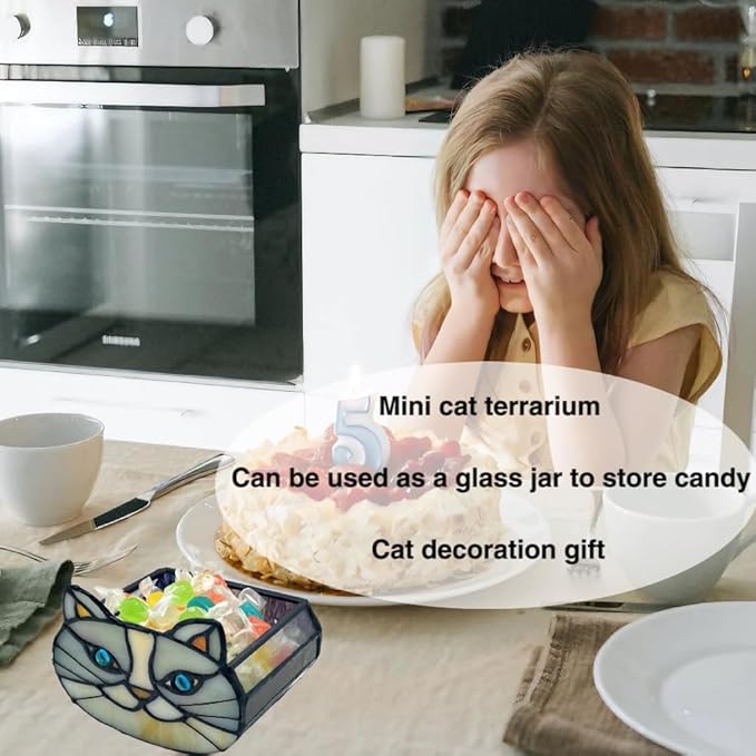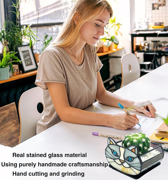 - Looking for a unique and beautiful way to display your plants;Tiffany's Adorable Cat Stained Glass Planter;Made with a corrosion resistant pure copper frame; these pots are not only functional but also beautiful; Each flower pot is handcrafted and can be used for planting; dried flower arrangement; candle holder; pen or cosmetic brush holder and so on; Perfect for decorating your dining table; living room;or anywhere else you want to add whimsy and charm