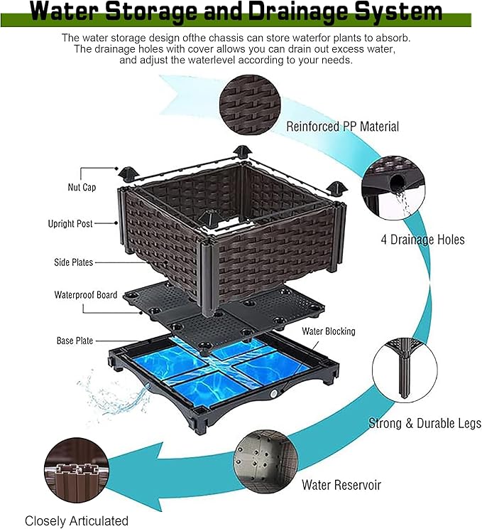 - 🌻【Durable Outdoor Growth Box】Our elevated planter boxes are made of reinforced PP material with a rattan pattern that is durable, lightweight, high load bearing, washable and reusable.