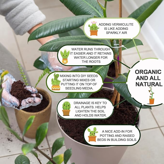 - ❤️Say Goodbye to Slow Plant Growth - You can try using vermiculite to make a soilless mixture. Garden vermiculite is good for mixing into soils for house plants to help the soil not dry out as it holds onto moisture. Another way to use this is mixing into DIY plants starting mixes or putting it on top of seedling media. It is very lightweight so the seedlings won't have a problem poking through it. It lightens the soil for better root growth. Helps growth in new beginning plants.