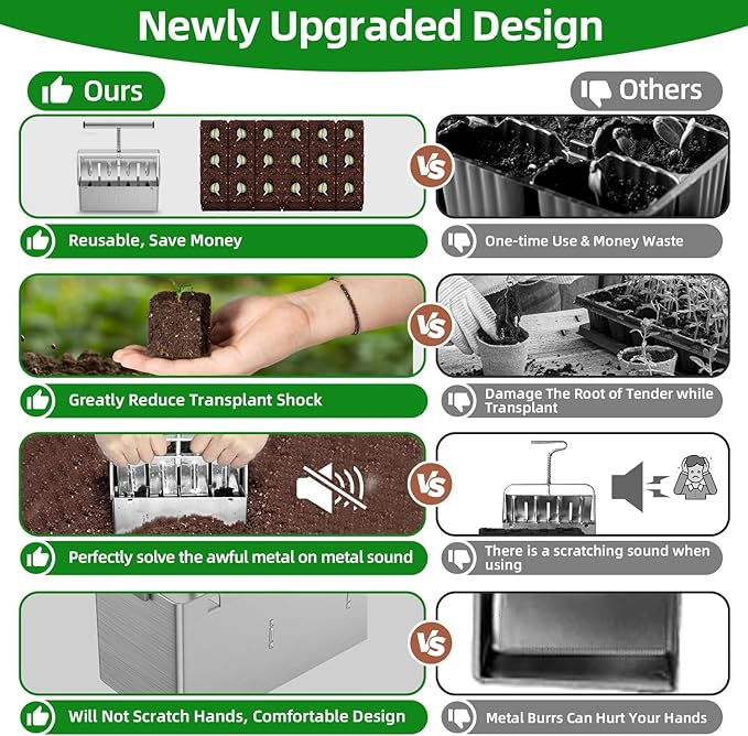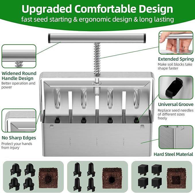 - 【2024 New Upgraded Soil Blocker for Seed Starting】In order to provide a more satisfying product experience than others, we designed this new Soil Block Maker with smooth edges without any risk of harm, rust-resistant durable stainless steel material, and super stable structure for long time comfortable use!