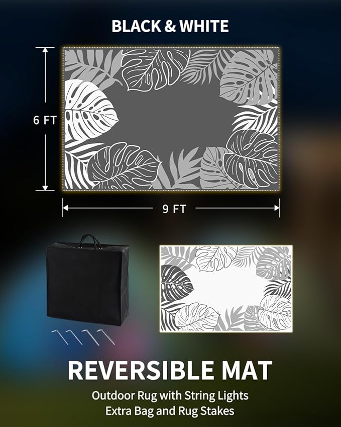 - Reversible&Wide Use: Outdoor rug featuring advanced black surface and visually expanding white side, patio rug creates perfect outdoor decor for relaxation and entertainment. The delicate flower pattern adds personality, making it ideal for gardens, patios, balconies, backyards, beaches, and indoor areas. Available in sizes: 5x8, 6x9, 8x10 and 9x12.