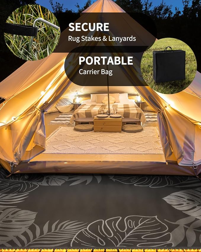 - RV traval&Camping: This camper must haves outdoor rug is ideal for picnics, gatherings, and RV trips! The lightweight outdoor camping carpet with foldable lines is easy to carry and saves space. Includes an extra carry bag and rug stakes for 6x9 ft, 8x10 ft and 9x12 ft. Grass-friendly, durable, and easy to clean, this outdoor rug enhances outdoor adventures.