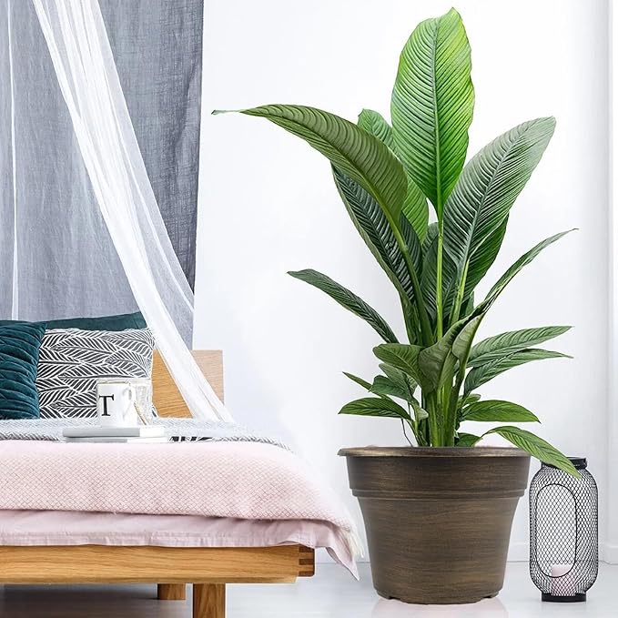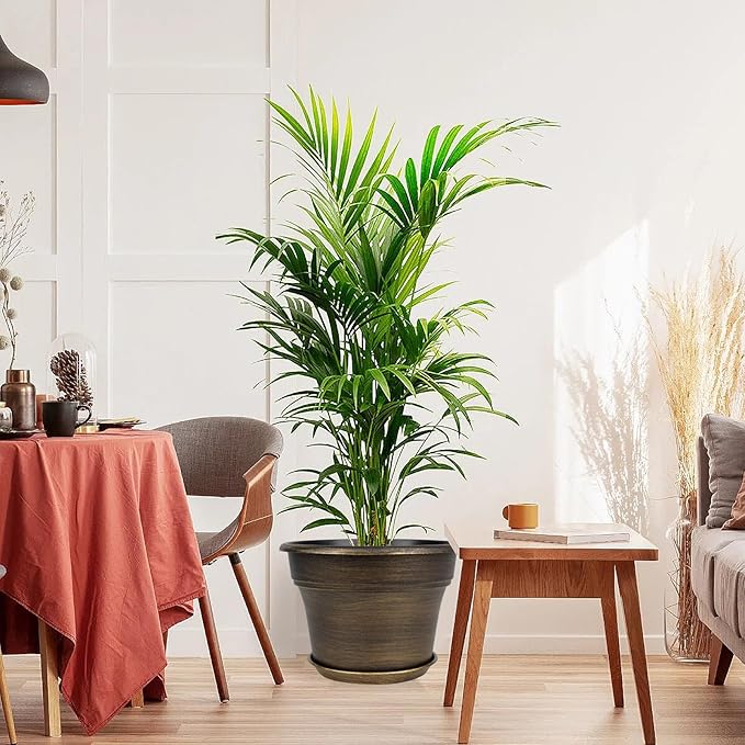 - 【TRADITIONAL DESIGN】Plastic planters for indoor plants with trays are designed in in dark gold colors & a classic look, which allow this pot to fit into any indoor & outdoor setting. With these golded flower pots, it could adds fresh, decorative flair to your home. Decorate your windowsill, desktop, shelf, bedroom, living room, kitchen, garden, office with our 16 inch large plastic plant pot.