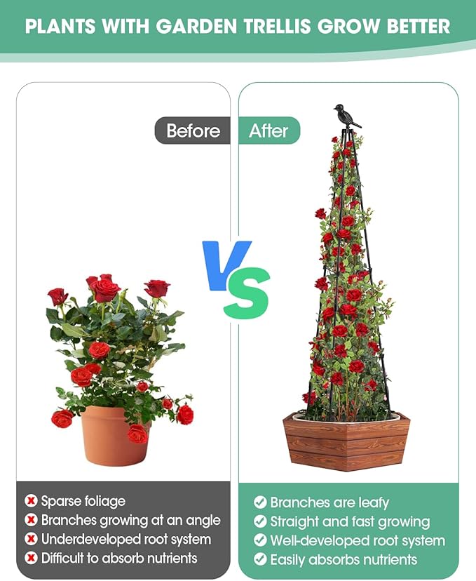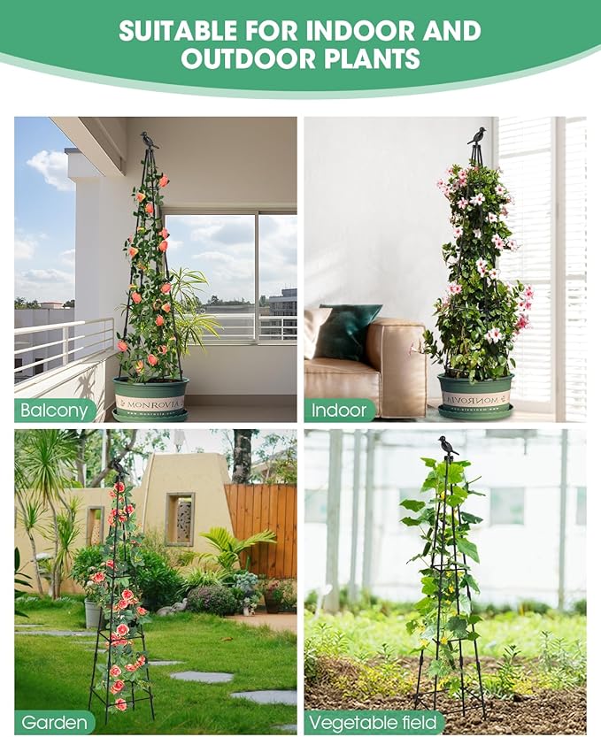- Rustproof Material & Strong and Sturdy: Material of our garden obelisk trellis: Metal Pipe with PE Plastic Coating, can prevent the inner iron pipe from rusting, waterproof, sun protection, durable and long service life. It is permitted outdoors or indoors for climbing plants, potted plant, flowers, tomato etc.