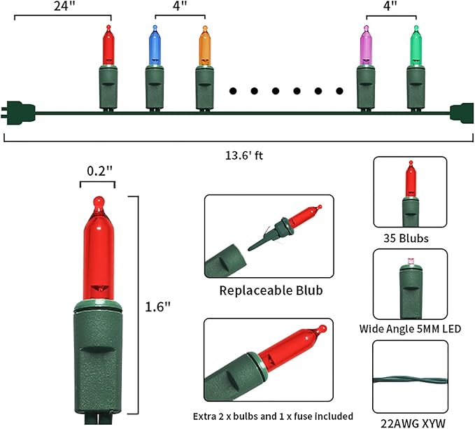 - 【Mini Christmas Lights Specification】: 1 Sets - green wire chritsmas light string includes 35 count multicolor LED lights, total length 13.6ft, lights length 11ft and each led is 4 inches apart, 24 inches lead wire, 4 inches end connector (Extra 2 x bulbs and 1 x fuse included)