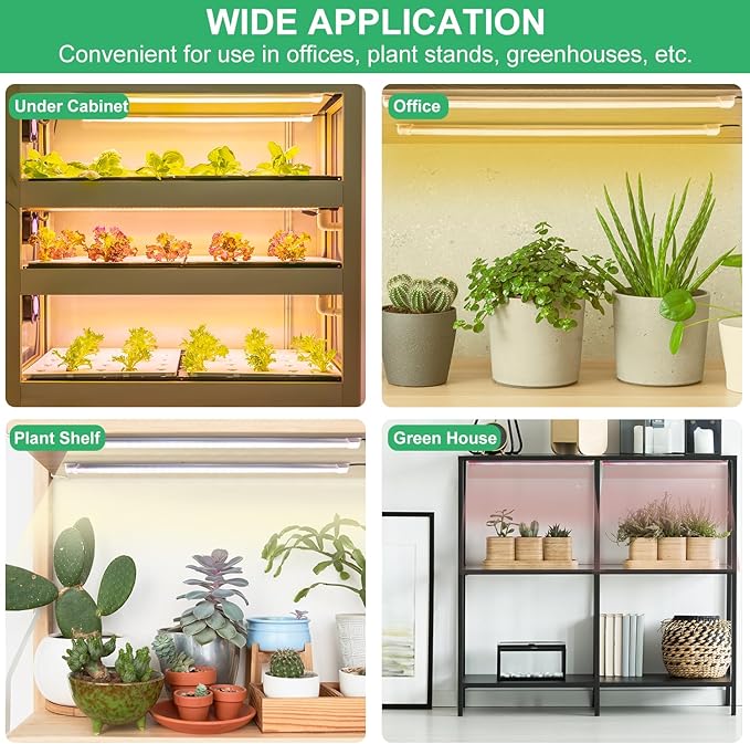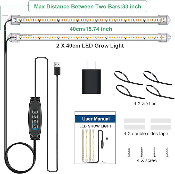 - [Easy & Flexible Installation]- The grow bar light come with 4 cable ties, 8 screws, 4 double-sided tape to provide 3 mounting options. You can use double-sided tape to stick to the surface or use the zip ties to fix the bars on the shelf or fix them with the screws. The power cord is 95 inches long for easy using in office,indoor,plant shelf,greenhouse etc.