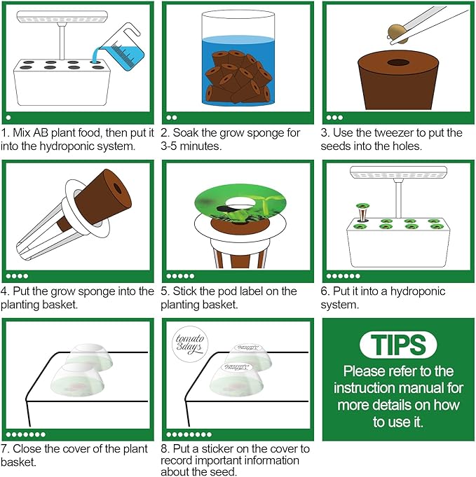 - Package Contents: You will receive 50 grow sponges, 1 A&B plant food, 1 A&B plant food refill, 18 plant baskets, 18 covers, 50 pod labels, 70 sticker labels, 1 tweezer and 1 manual.