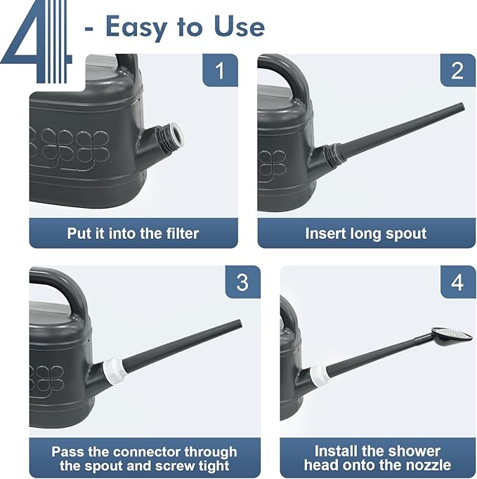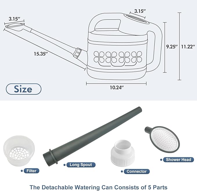 - [PRECISE WATERING, WATERING FLOWERS WITHOUT WORRY]-Plant watering can has a removable long spout, easy to carry and store, when installing, pass the connector through the spout and screw tight, seals well with no leak. Long spout watering can easy to reach distant plants, watering easily without bending over or tilting it too much, it easy to control the overall water flow, directing water exactly where it is needed, allowing every part of the plant to fully absorb the water.