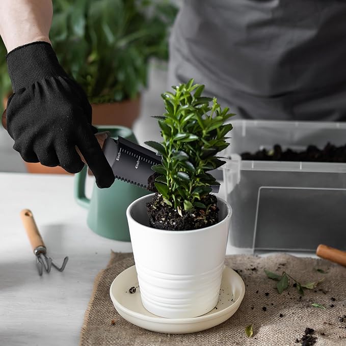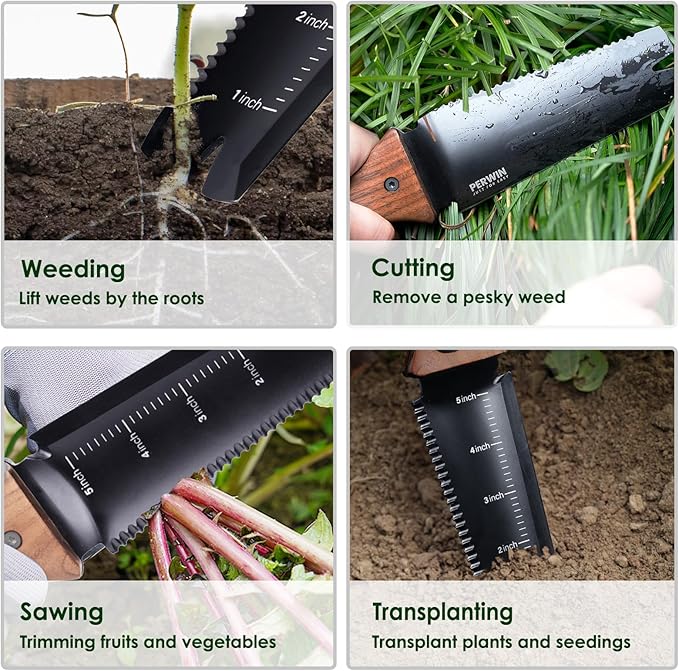 - MULTIFUNCTIONAL DESIGN: This soil knife boasts a versatile design with a serrated blade on one side and a straight edge on the other, facilitating sawing/cutting, trimming plants, and weeding. The spade blade, approximately 6" long, includes an engraved measuring ruler for precise hole depth measurement, simplifying digging tasks. Sharp blades and toothed edges enable easy soil penetration, making it an effective tool for a variety of gardening tasks.