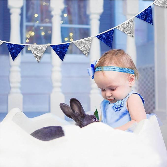 - Package Contains - 1 packs of sequin silver blue party pennant banner, Each string is 8ft with 12pcs flag,Size of each flag is 5.31 x 4.72 inch.