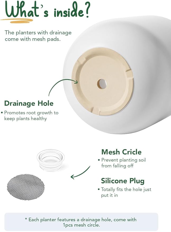 - Drainage Hole & Accessories: Each indoor planter pot features carefully designed drainage hole to maintain optimal soil moisture; The inclusion of silicone plugs and mesh pads provides added convenience, giving you flexibility in how you care for your plants