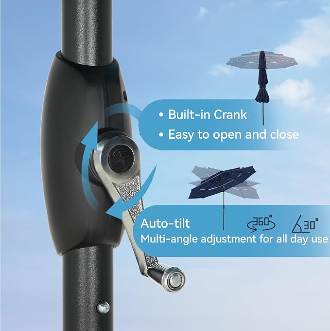 - 【Convenient Crank & Tilt System Table Umbrella】This outdoor umbrella is designed with crank open system for easy and quick use,The Auto tilt for all day use,for more angles of shading, keeping away from the hot sunlight. Ideal for both residential and commercial locations