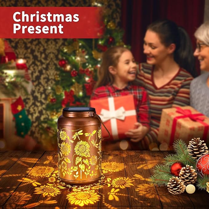 - 【EXQUISITE PATTERN】The hanging solar garden lantern dragonfly light adopts retro hollow design with warm light with sunflower pattern, casting beautiful patterns on the wall or lawn, christmas gifts for family mom women grandma birthday,sister,friendship and friends during holidays.SIZE:7.20"H x 4.4"W x 4.4"L.