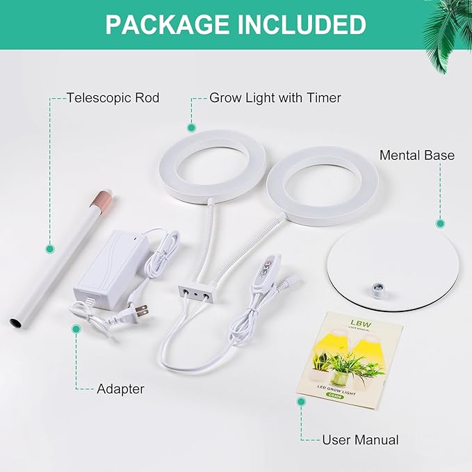 LBW Halo Plant Grow Lights, Dual-Head Desk Grow Light for Indoor Plants, 72x2 LEDs Full Spectrum Grow Lamp with 4/8/12H Auto Timer, 4-Level Brightness, Flexible Gooseneck, Height Adjustable, White