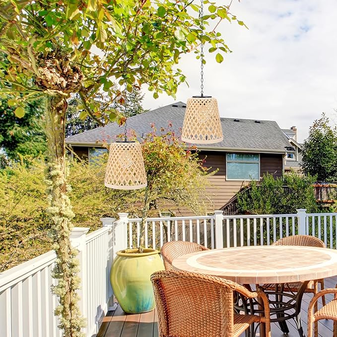 2-Pack Bamboo Woven Outdoor Chandelier Small Hanging Rattan Solar Pendant Lights Modern Retro Boho Pendant for Gazebo Yard Porch Patio Garden Backyard Decor