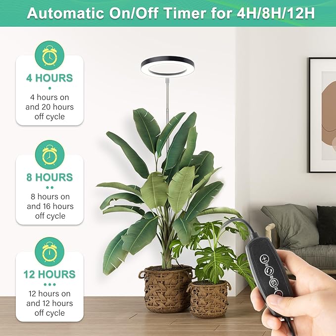 - Auto On/Off Timer and 10 Dimming Levels: Take control of your plants' lighting needs with easy-to-set timed dimming functions. Select from 4, 8, or 12-hour cycles, and the light will automatically turn on/off at your pre-set times. With 10 adjustable brightness levels(10% to a powerful 100%), you have precise control over the lighting intensity.