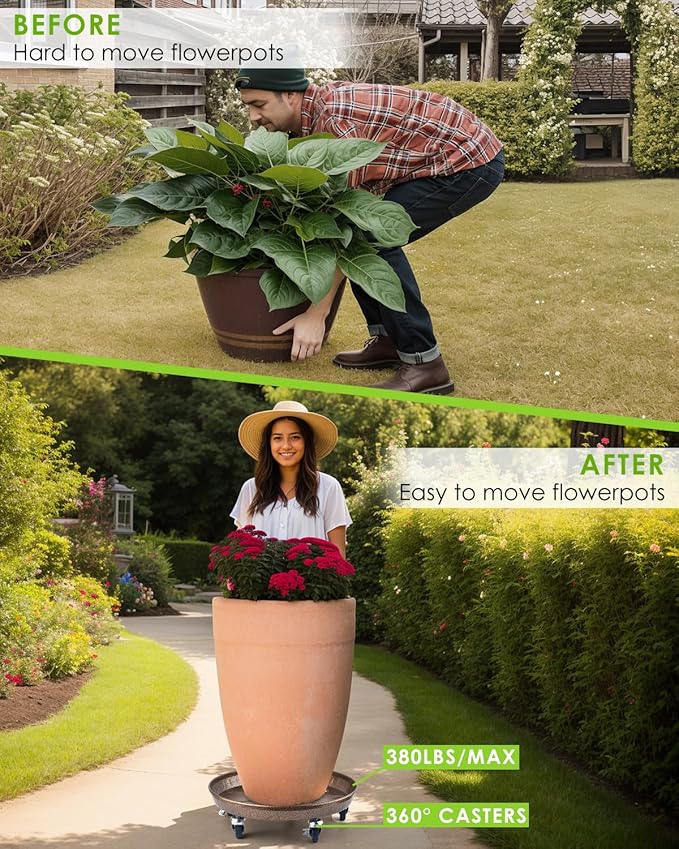 - đ·ăWidely Used Indoors/Outdoorsă-plant roller has a good load-bearing capacity, not only can be used as a plant cart, but also can help you carry heavy objects, such as furniture, wine barrels, free-standing stoves, etc. Ideal for gardens, yards, courtyards, outdoor environments. Make your relocation very easy!