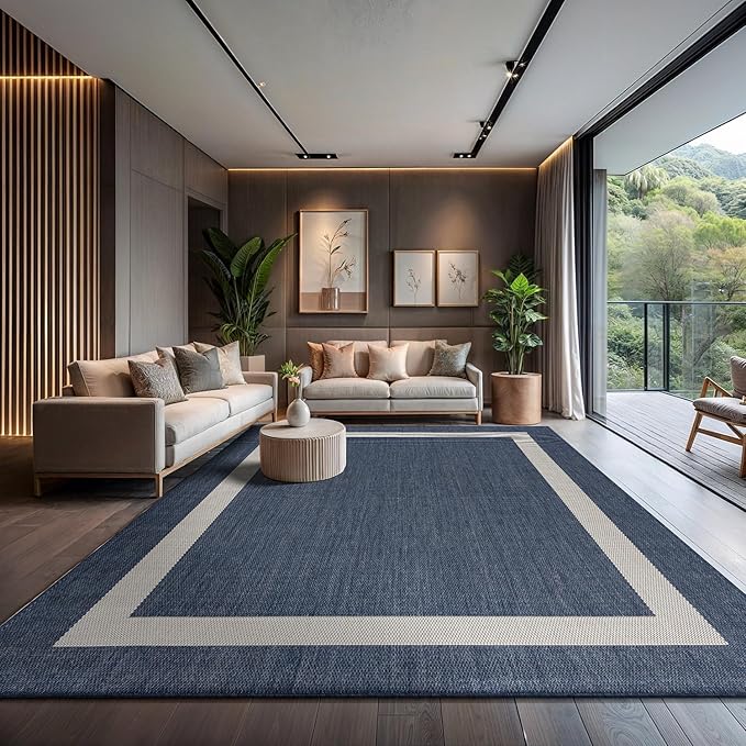 CAMILSON Outdoor Rug 9x12, Large Modern Outside Rugs for Patios Porches Waterproof Durable Washable Non-Shedding, Easy-to-Clean Indoor Outdoor Area Carpet (9 x 12, Bordered - Blue/White)