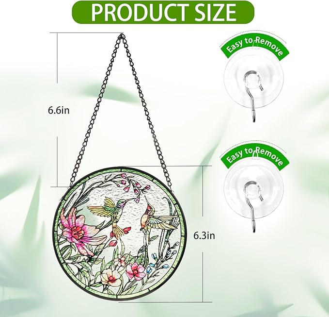 - [EASY TO HANG] 6-inches hummingbird stained glass window hanging is the right size to add a focal point to your home decor without obstructing the view. Each panel comes with a pre-installed metal chain and 2 suction cup hooks, allowing you to easily hang them wherever you like. We attach great importance to product quality and make every product carefully. If you have any questions, please tell us and after-sales service will solve them for you as soon as possible