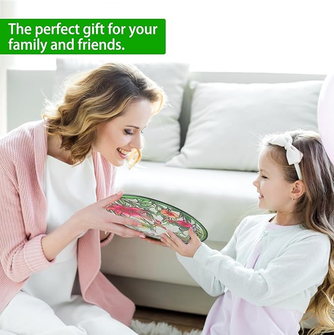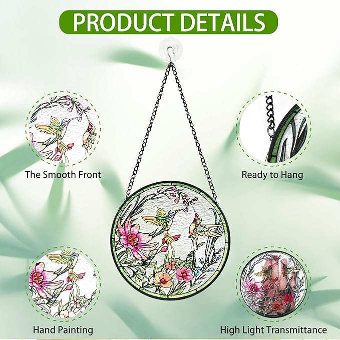 - [HANDMADE CRAFTSMANSHIP] The handmade hummingbird stained glass window hanging is crafted from glass rather than plastic. The exquisite craftsmanship makes the window hanging more classic and exquisite, not only vividly delineating the form of the hummingbird but also showing the unique texture and beauty of the glass material. Each hand painted hummingbird window suncatcher adds to the distinctive value and attraction of the hummingbird stained glass window hanging