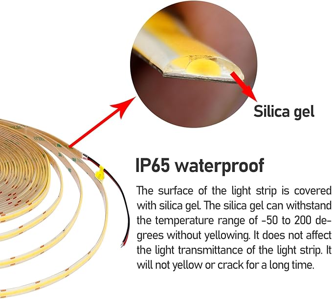 - 【Widely use】The COB LED strip light is Cuttable and self-adhesive backing suitable for Home decoration,such as Cabinet,Kitchen,stair,mirror,Decorative lighting for high-end entertainment venues.
