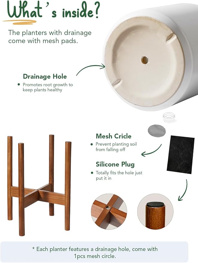 - A Complete Set: Tailored for plant enthusiasts like yourself, this bundle features a 10-inch plant pot paired with a reversible acacia wood stand, harmonizing style and functionality flawlessly; With drainage hole, removable silicone plug, and feet pads for floor protection, it guarantees your greenery thrives while safeguarding your floor's condition; Embrace the allure of mid-century aesthetics as this set seamlessly elevates your home decor, captivating your guests with its botanical charm
