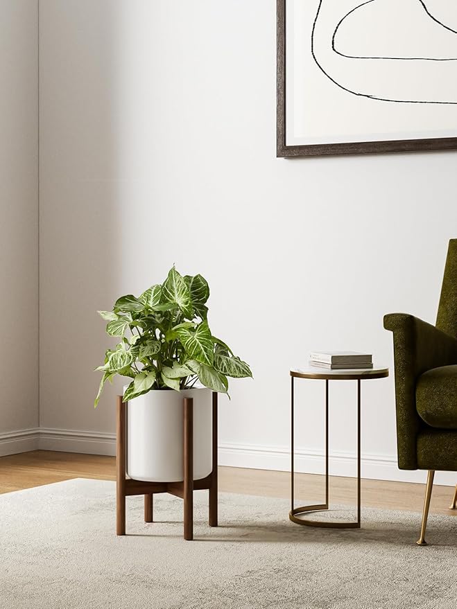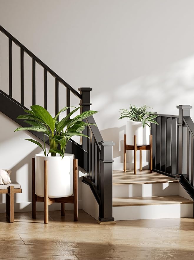 - Stylish Design, Easy to Clean: Our chic pot for plants boasts a sleek modern aesthetic complemented by a mid-century wood stand, Its versatile design effortlessly blends with any decor, adding a touch of sophistication to your living room, stair corner, bedroom, or any desired area; Plus, maintaining is a breeze thanks to its smooth ceramic surface — wipe with a soft damp cloth to keep your planter looking fresh and vibrant